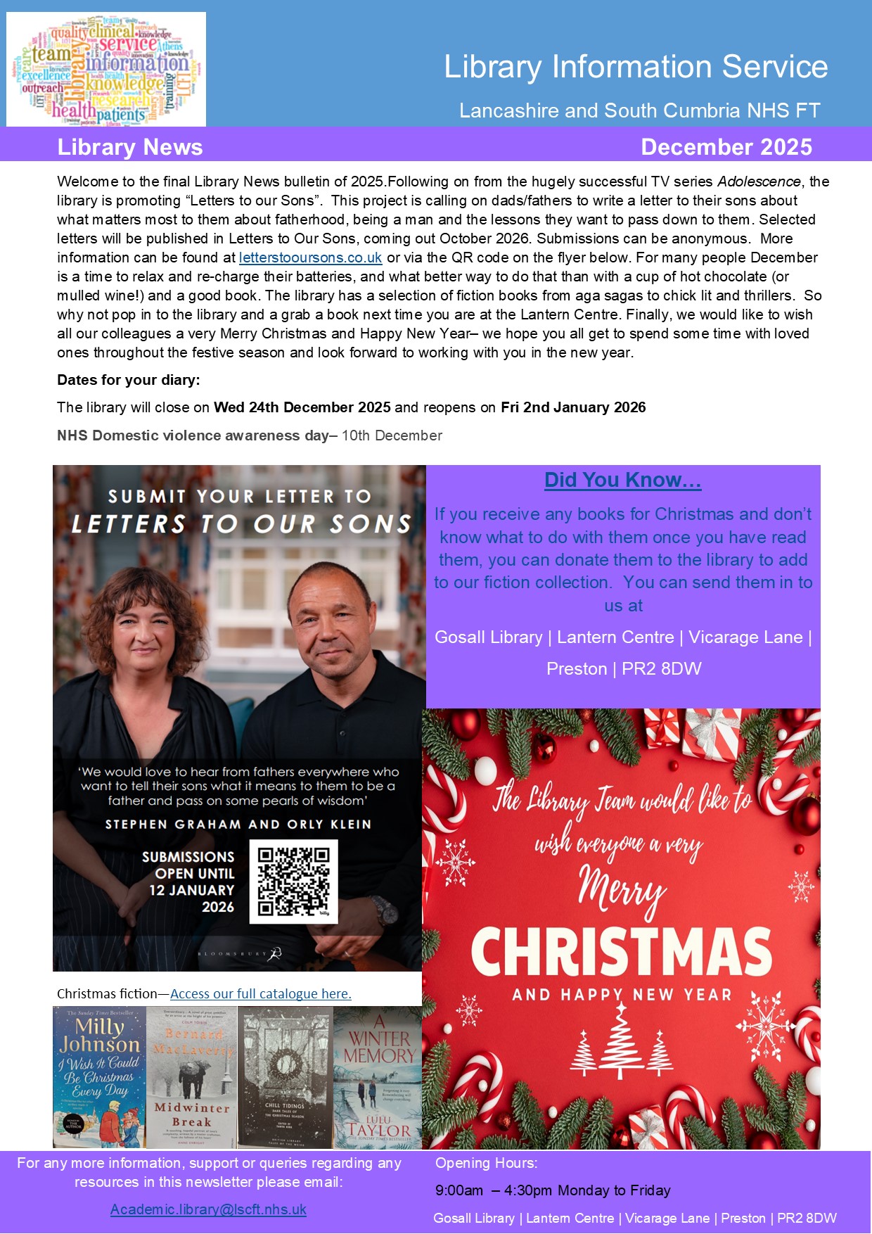 Please take a look at our December Library newsletter. This month we are encouraging all fathers to ‘Submit a letter to our sons’ writing about what matters most about fatherhood and lessons you want to pass down. This is supported by Stephen Graham and Orly Klein – who worked on the TV series Adolescence and hope to increase the communication between fathers and sons.